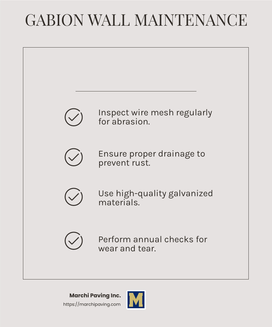 Repair Tips: If the wire mesh shows signs of rust or wear, replace affected sections promptly. For displaced stones, refill and compact as necessary to maintain the wall’s integrity.